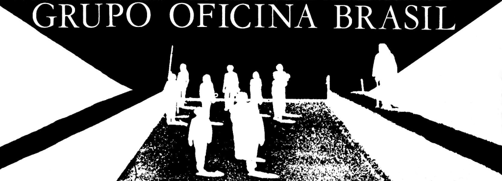 EBERT: No Oficina eu fotografei muito. A marca da oficina na época, que era uma estilização da bigorna, é uma fotografia que eu fiz quando a gente fez o espetáculo. A gente estava trabalhando num espetáculo, a gente chamava de “Espetáculo Novo”. Não tinha nome ainda. Depois virou Gracias, Señor. A gente fez um teste do Espetáculo Novo na Universidade de Brasília. E a Universidade de Brasília, como tudo em Brasília, tem aquelas passagens subterrâneas. E a gente fez no espetáculo uma caminhada que entrava numa daquelas passagens subterrâneas e eu, com a minha Leica pendurada no peito, vi – quando estava todo mundo saindo da passagem subterrânea, eu vi a bigorna do oficina desenhada pela sombra da passagem subterrânea e as pessoinhas todas ali. E aí fiz a marca do Oficina. Com essa foto. Fiz um alto contraste nela e tal, acertei a simetria direitinho, fiz uma bigorna gigante com as pessoinhas saindo dela.
